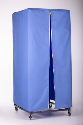 The external cover is placed over the container and closes in the front with one zipper, and the roof is sewn into the cover’s body.