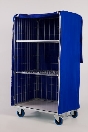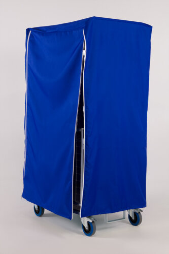 The external cover is placed over the container and closes in the front with two zippers, and the roof is sewn into the cover’s body.